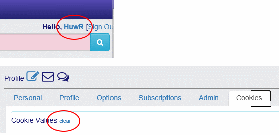 To clear your cookies, click on your username in the top right corner of the forum, next to the [SignOut] link, navigate to the [Cookies] tab and then click the 'clear' link as below