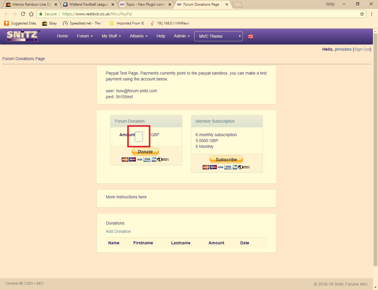 Test page posted https://www.reddick.co.uk/Mvc/PayPal Feel free to test, it points at paypal test server, you will need to use the provided credentials on the test page to make a payment (Admin functions on the Donations link not currently working)